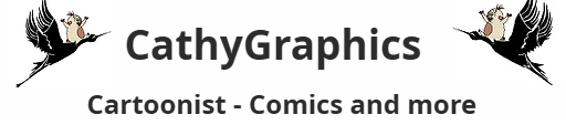 Comic strip characters in clear line with Winifred' family, pugs  available in mini-comics, humorous cards and caricatures.